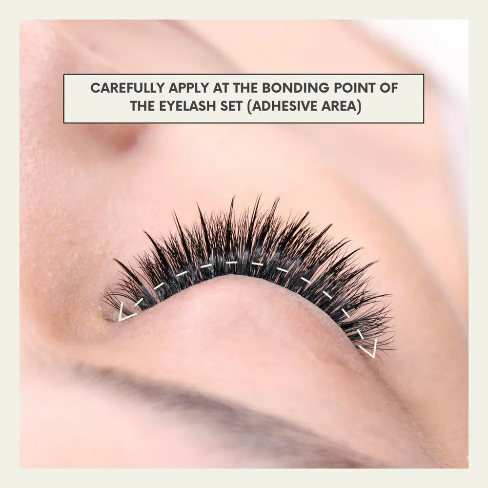 1.) 3minutes after you've completed the eyelash treatment, apply 1 small drop of Superbonder lash Sealant onto a microfiber brush and carefully apply at the bottom 1mm of the eyelash set (adhesive area). Make sure to apply only a small drop of the product to avoid getting it into the client's eye, which may cause eye irritation and/or stinging.